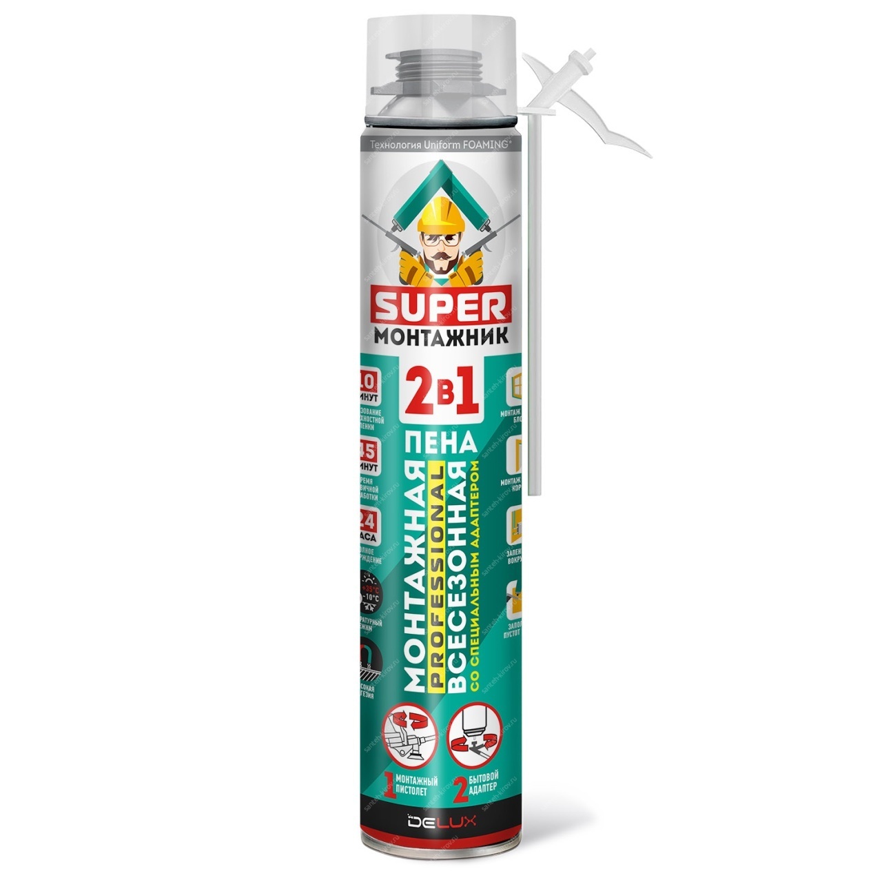 Однокомпонентная полиуретановая профессиональная и бытовая монтажная пена, специально разработанная для круглогодичных работ по монтажу окон, дверей и других строительных конструкций. Баллон укомплектован специальной трубкой-адаптером, что позволяет проводить работы как с использованием монтажного пистолета, так и без него. Пена имеет улучшенную производительность, обеспечивающую экономию при нанесении. Обладает высокой адгезией к большинству строительных материалов: бетон, кирпич, дерево, металл, пластик и т.д., за исключением полиэтилена, полипропилена и фторопласта. Обеспечивает хорошую тепло- и звукоизоляцию. Затвердевает под действием влаги из воздуха. Ее можно резать, штукатурить, окрашивать. Пена безвредна для озонового слоя атмосферы.
