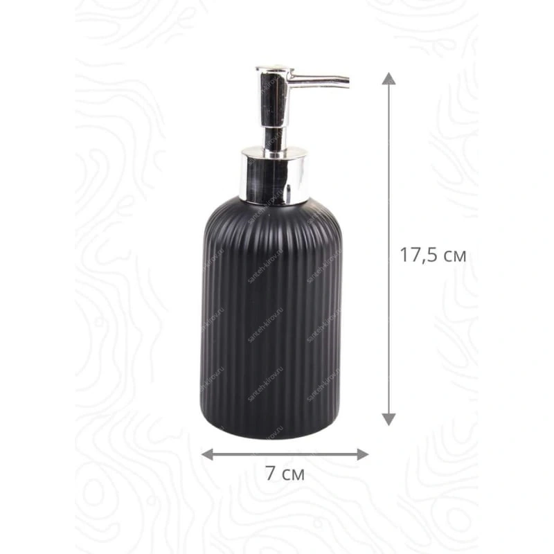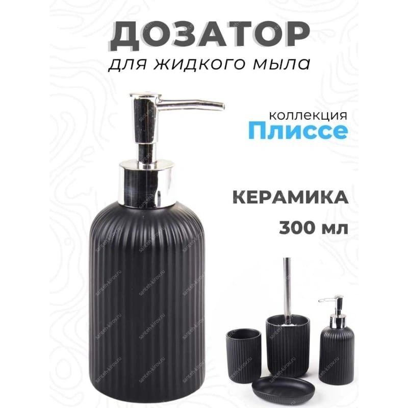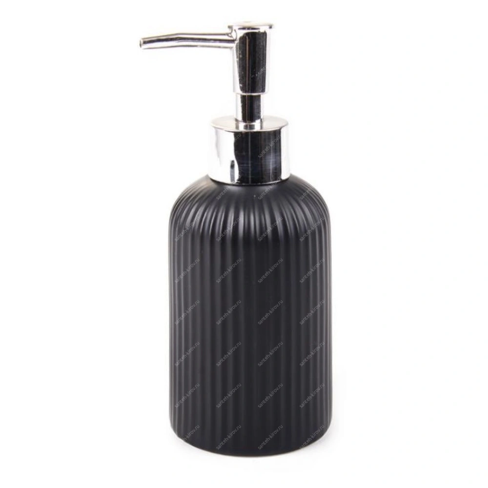 Дозатор для жидкого мыла Плиссе черный цилиндрической формы с ребристой поверхностью, предназначен для порционной подачи мыла, шампуней и других гелеобразных жидкостей. Подача моющего средства осуществляется с помощью пластиковой хромированной помпы. Влагоустойчив.