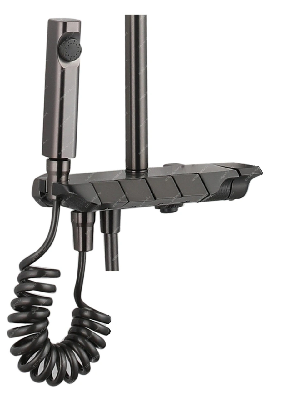 стационарной трубкой с тропическим душем; массажной лейкой на гибком шланге; гигиеническим душем; смесителем с картриджем; переключателем потока; держателями леек; элементом фиксации.