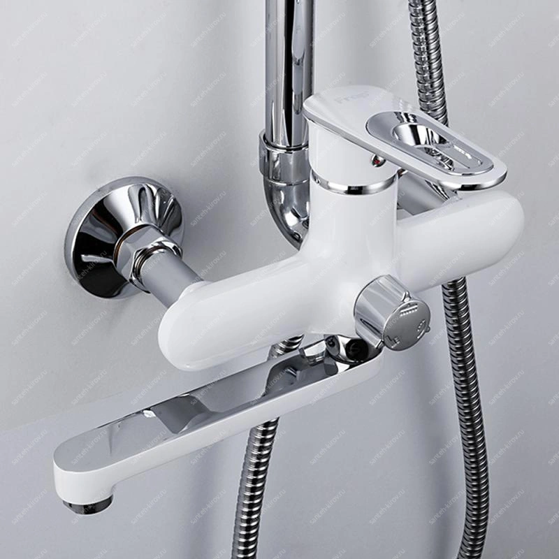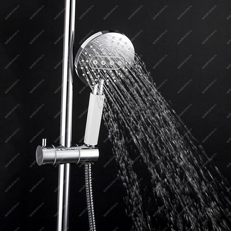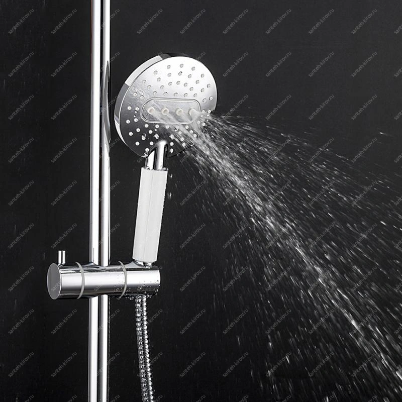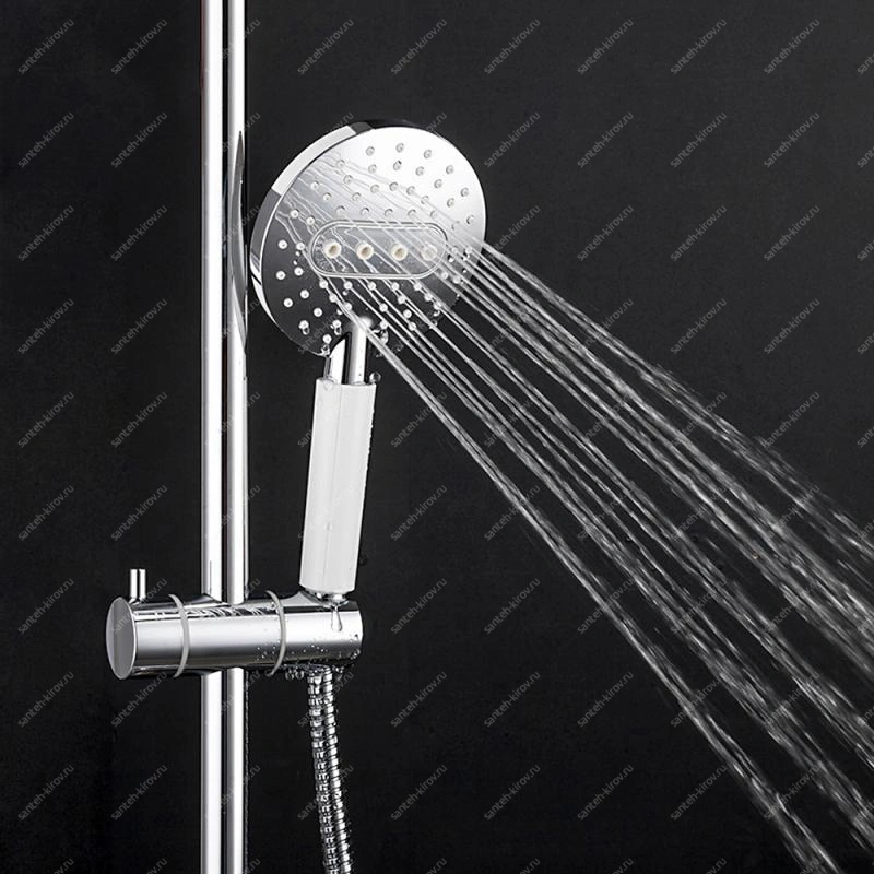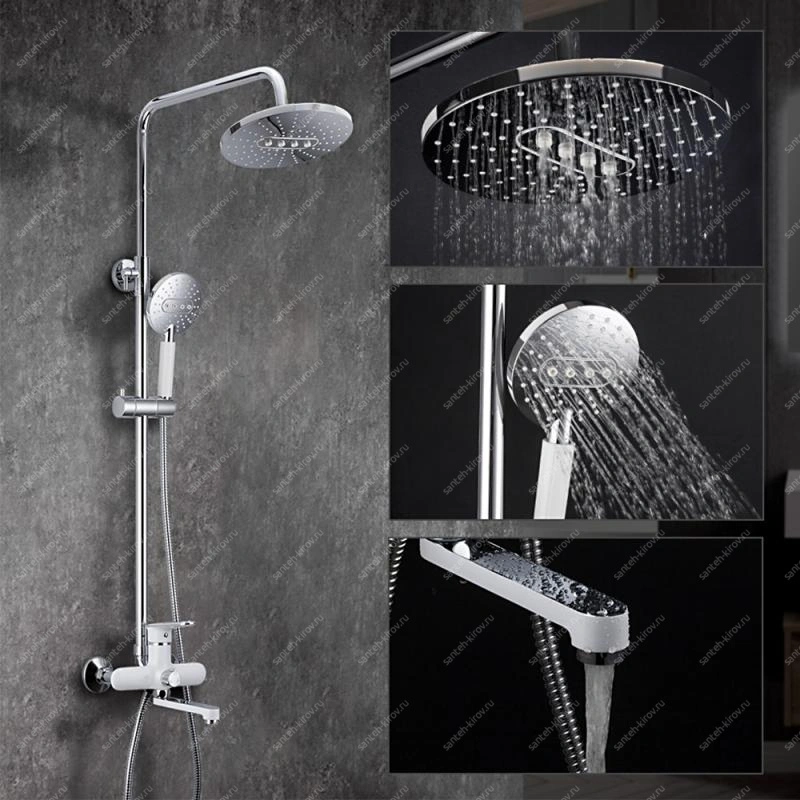Душевая система со смесителем Frap F2449 имеет потрясающий современный дизайн с белым и хромированным покрытием. У душевой системы очень хорошие лейки. Тропический душ с функцией гидромассажа, который включается при помощи вращения самой лейки. Также и ручная, но уже с тремя режимами работы. Смеситель для стойки латунный, с коротким поворотным изливом - Frap F2449 хорошо впишется в маленькую кабину.