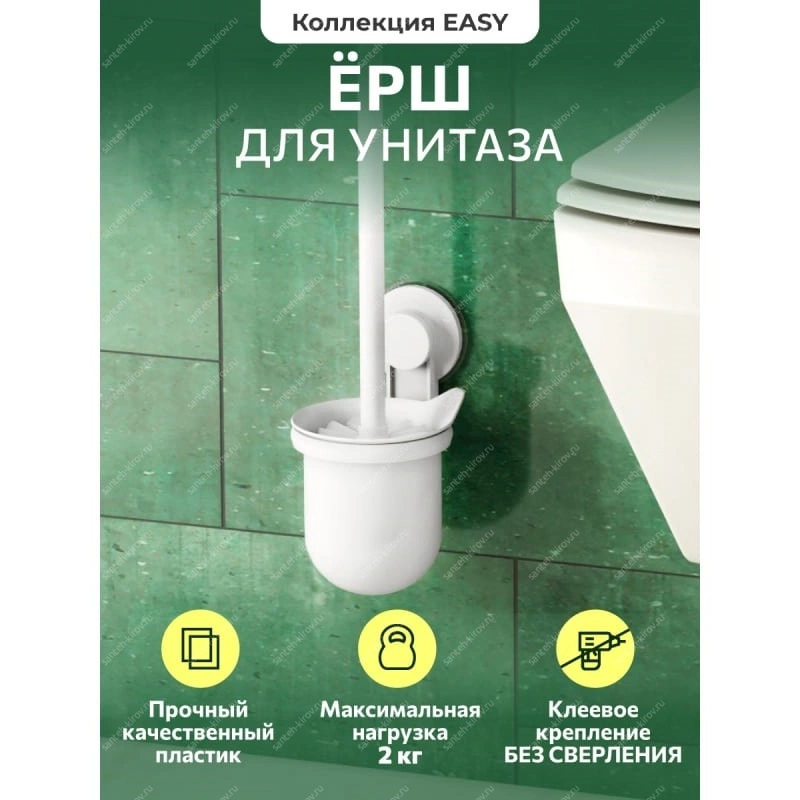 Ерш для чистки унитаза на липучке имеет надежное крепление, не требующее сверления стен. Современный дизайн ершика идеально впишется в любой интерьер. Высокая устойчивость к коррозии позволит использовать изделие под прямым попаданием воды. Не требует специального ухода.