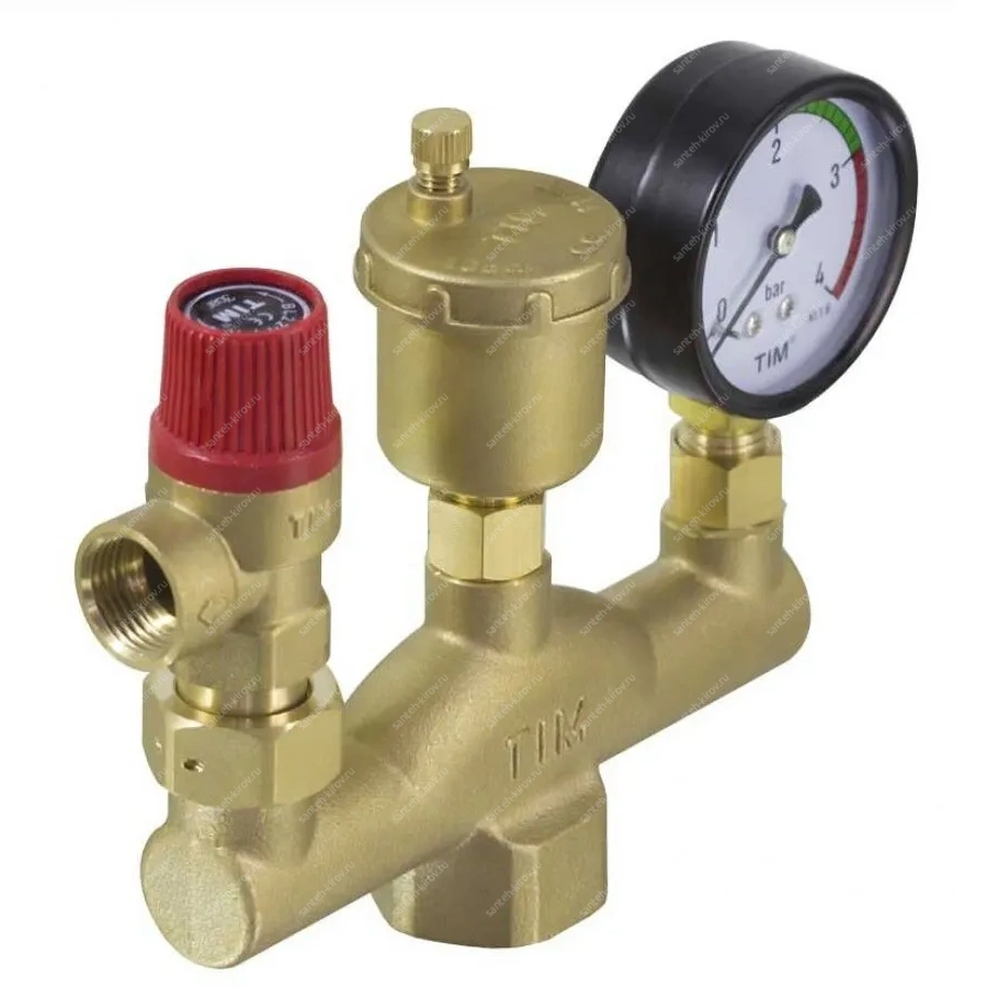 В состав группы безопасности входит предохранительный клапан, автоматический воздухоотводчик и радиальный манометр, смонтированные на общем основании ― консоли.