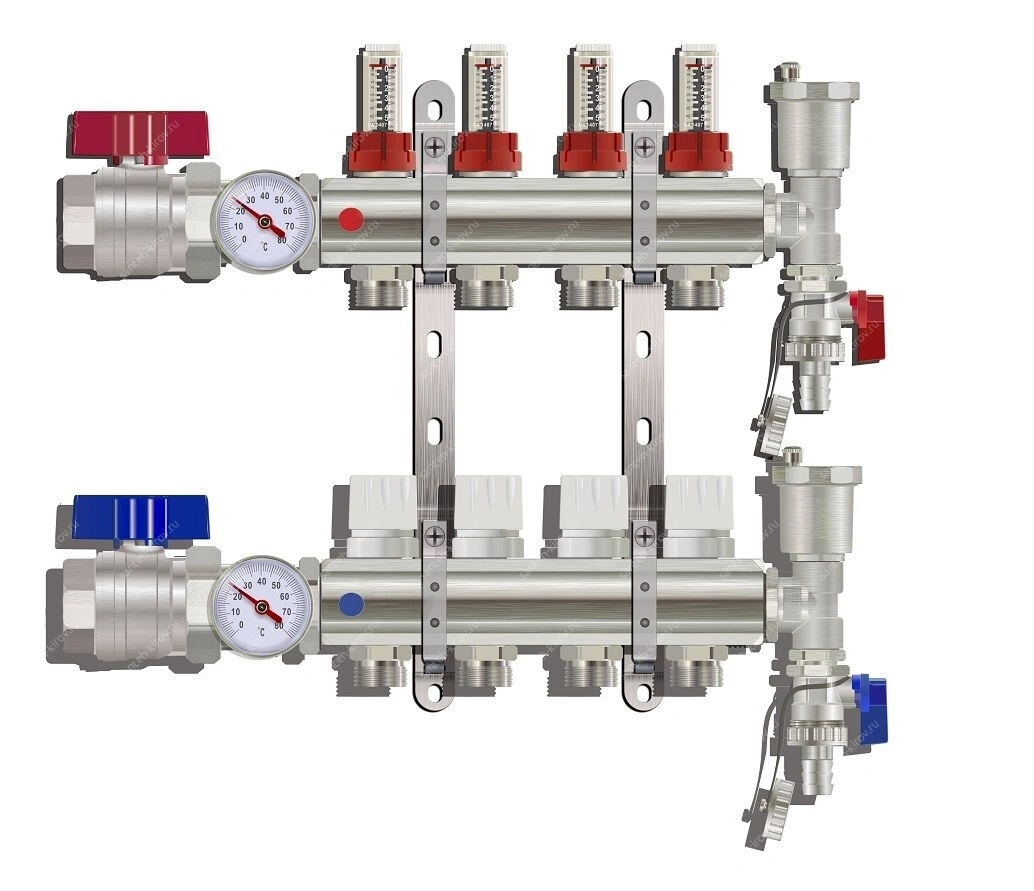 Коллекторная группа с расходомерами на 4 выходов 1 х 3/4 х 4 в сборе: с кранами, термометрами, расходомерами, регуляторами и тд.