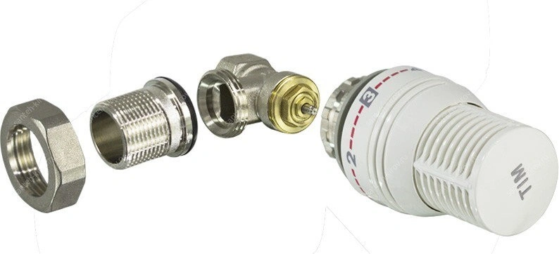 - Угловой клапан для автоматического регулирования расхода теплоносителя через отопительный прибор.