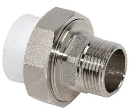 Муфта для соединения трубопроводных систем из полипропилена. Соединение "американка" позволяет при необходимости соединять и разъединять две жесткие или гибкие линии между собой, когда эти линии уже смонтированы в трубопровод.