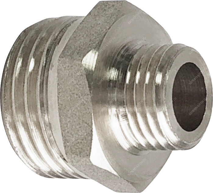 Латунный никелированный фитинг (переходник), представляющий собой изделие с наружной резьбой на обоих концах, с помощью которых он соединяется с другими участками трубопровода разного диаметра