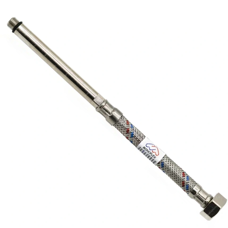 2. Оплетка из нержавеющей стали с вкраплениями красных и синих нейлоновых нитей, характеризующих горячее и холодное водоснабжение