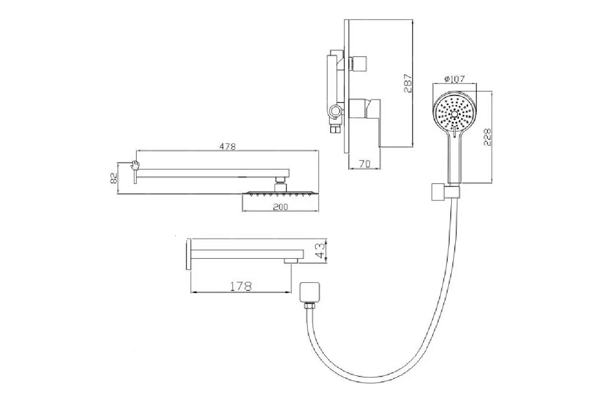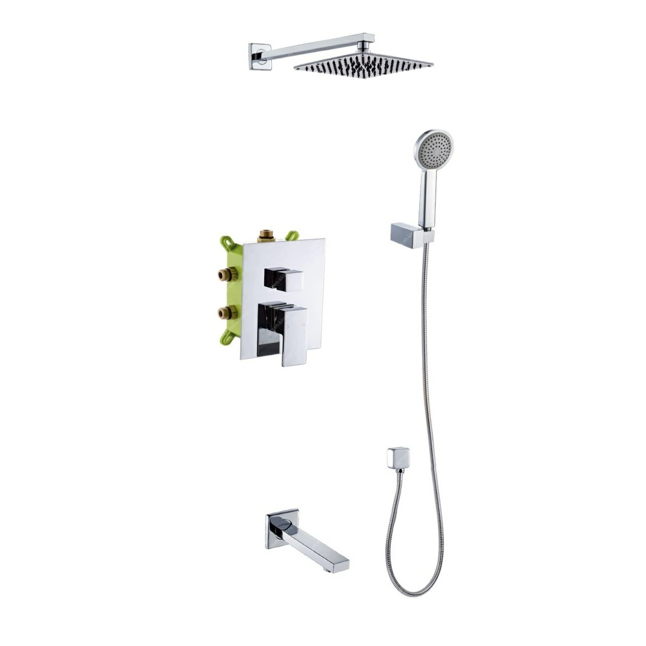 тропический душ; встроенный смеситель для ванны; скрытый корпус; излив; держатель для ручной лейки; шланг; лейка
