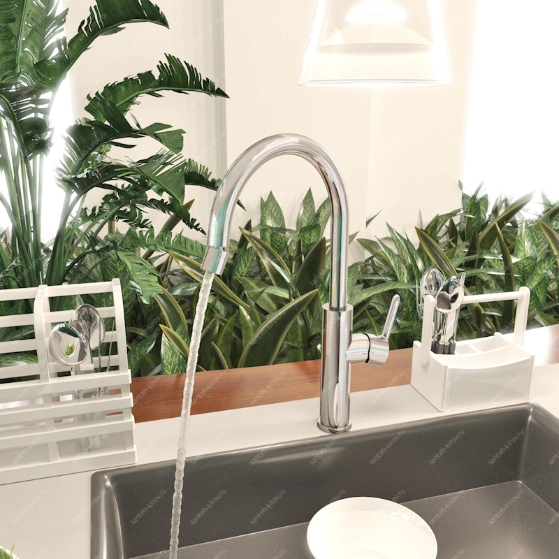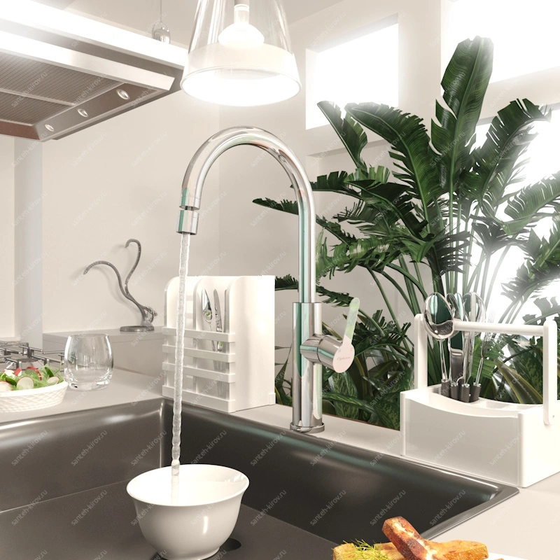 Смеситель для кухни монтируется на мойку. Этот сантехнический прибор служит для обеспечения нужной температуры воды и её напора. Внутри смеситель для кухни имеет кран-буксы или картридж, благодаря которым смешивается холодная и горячая вода.