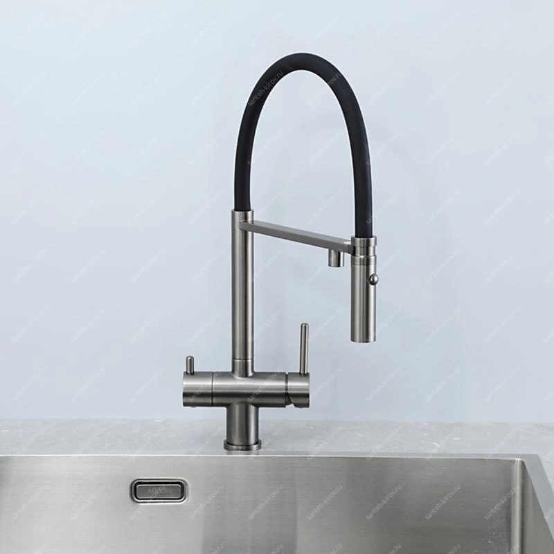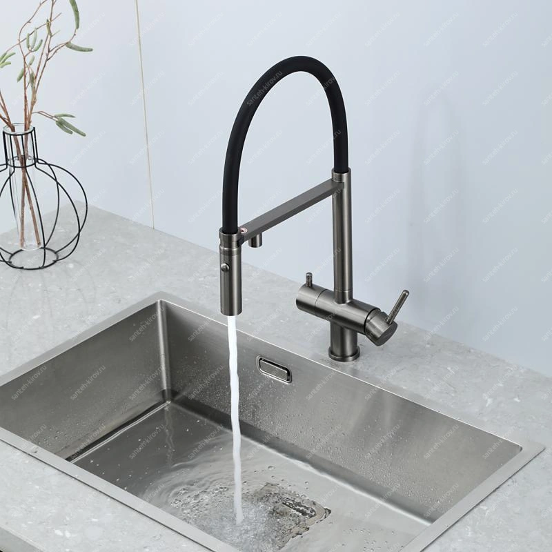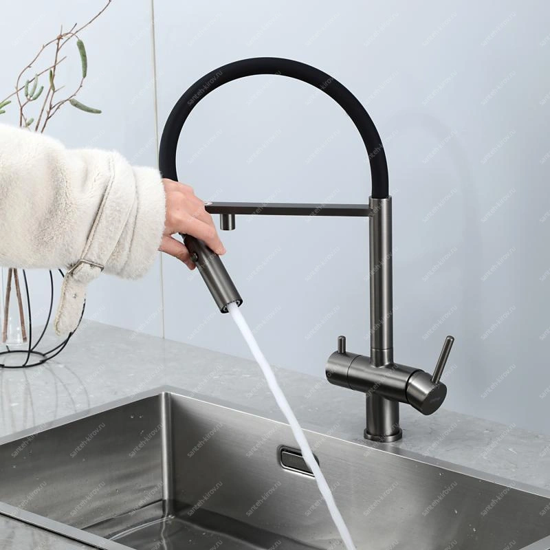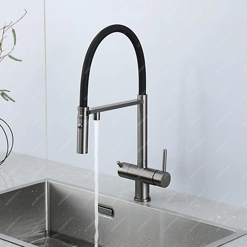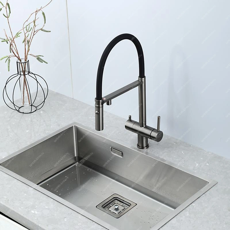 Смеситель для кухни, с подключением фильтра питьевой воды, монтируется на мойку. Этот сантехнический прибор служит для обеспечения нужной температуры воды и её напора. Внутри смеситель для кухни имеет кран-буксы или картридж, благодаря которым смешивается холодная и горячая вода.