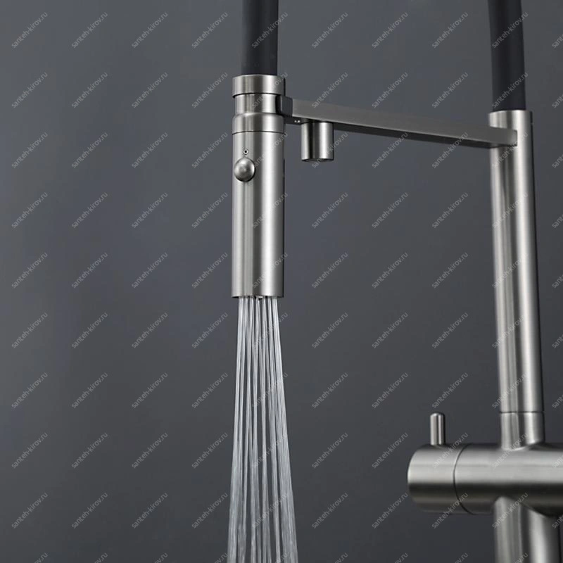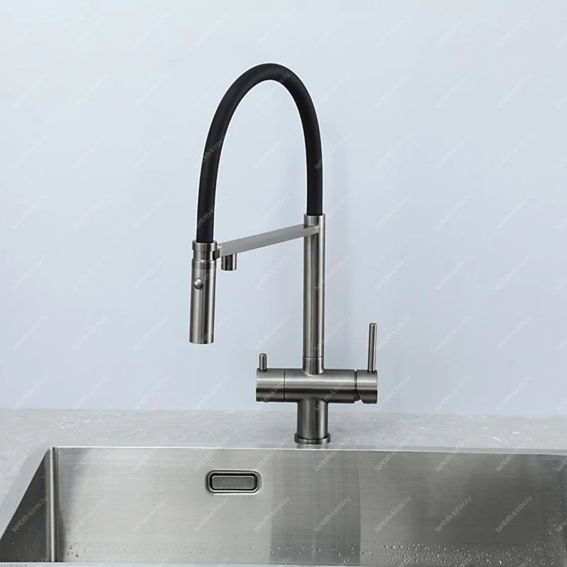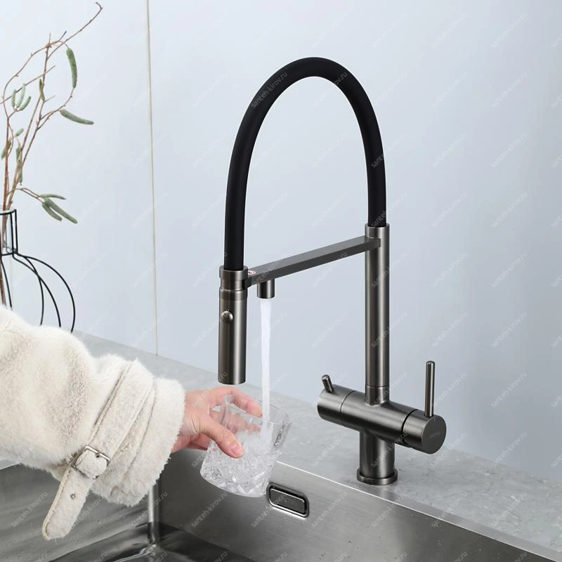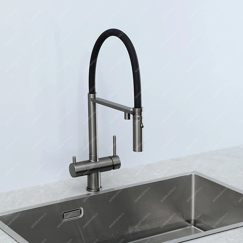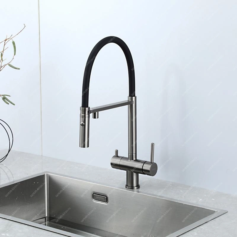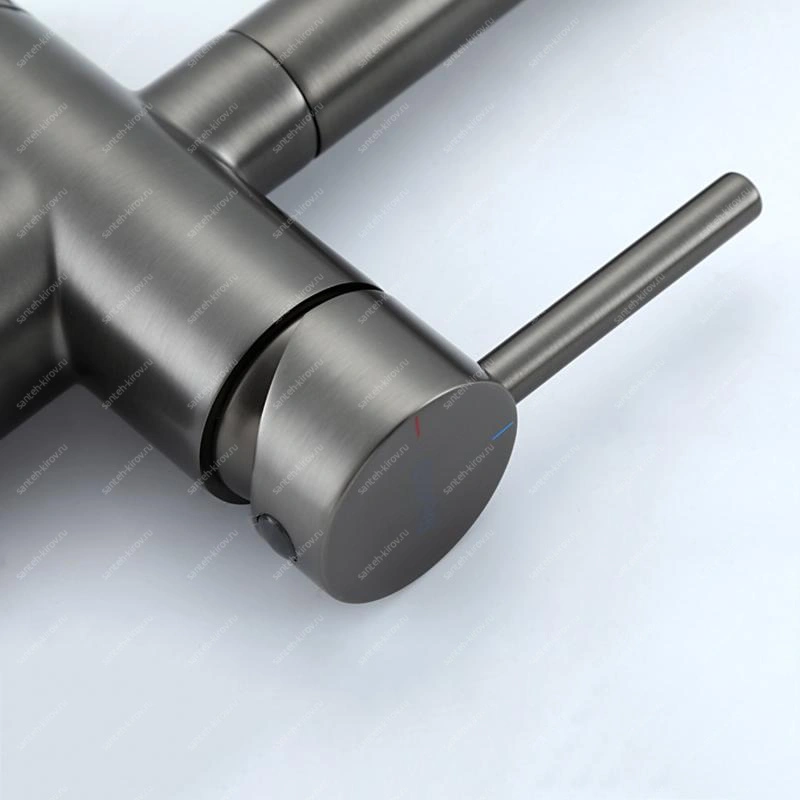 Смеситель для кухни, с подключением фильтра питьевой воды, монтируется на мойку. Этот сантехнический прибор служит для обеспечения нужной температуры воды и её напора. Внутри смеситель для кухни имеет кран-буксы или картридж, благодаря которым смешивается холодная и горячая вода.