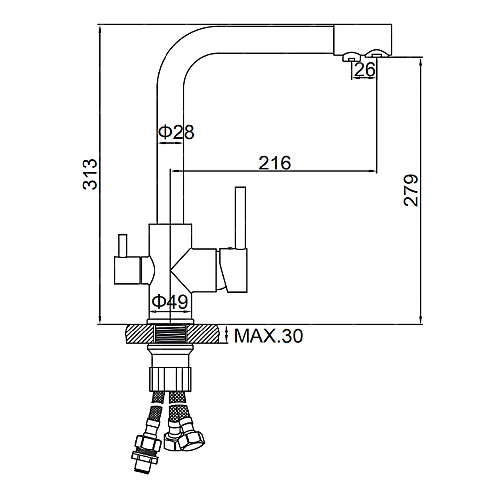 Смеситель для кухни, с подключением фильтра питьевой воды, монтируется на мойку. Этот сантехнический прибор служит для обеспечения нужной температуры воды и её напора. Внутри смеситель для кухни имеет кран-буксы или картридж, благодаря которым смешивается холодная и горячая вода.