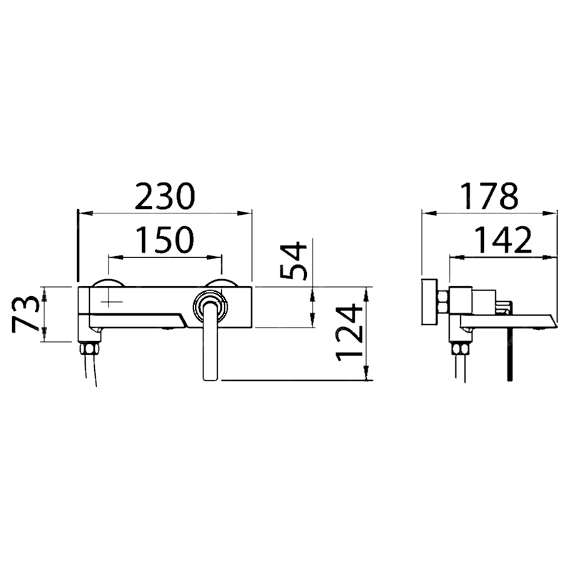 Смеситель для ванны и душа монтируется на стену. Этот сантехнический прибор служит для обеспечения нужной температуры воды и её напора. Внутри смеситель для ванны и душа имеет кран-буксы или картридж, благодаря которым смешивается холодная и горячая вода. Ширина подключения, мм — 150