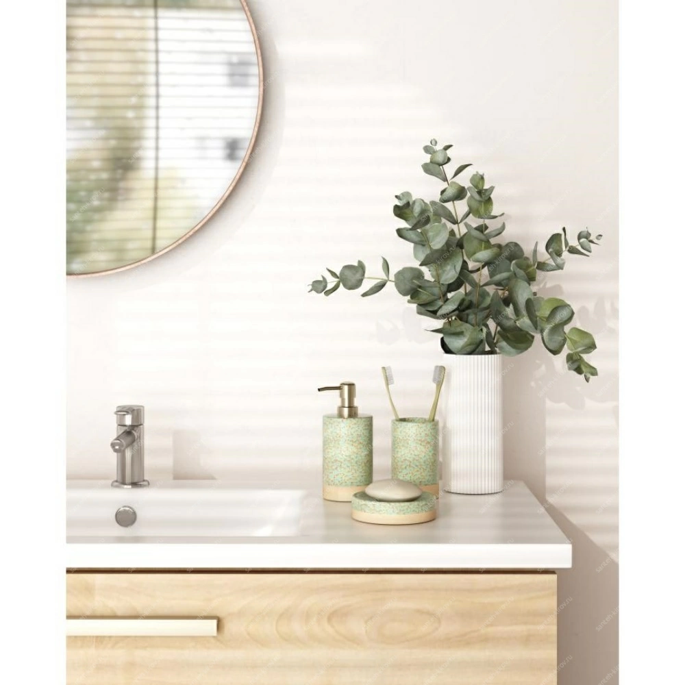 Коллекция аксессуаров для ванной комнаты Камея, выполнена в эко-стиле и несёт в себе идею тепла и уюта. Отличительной особенностью набора является рельефный узор, покрытый нежно-зелёной глянцевой глазурью.
