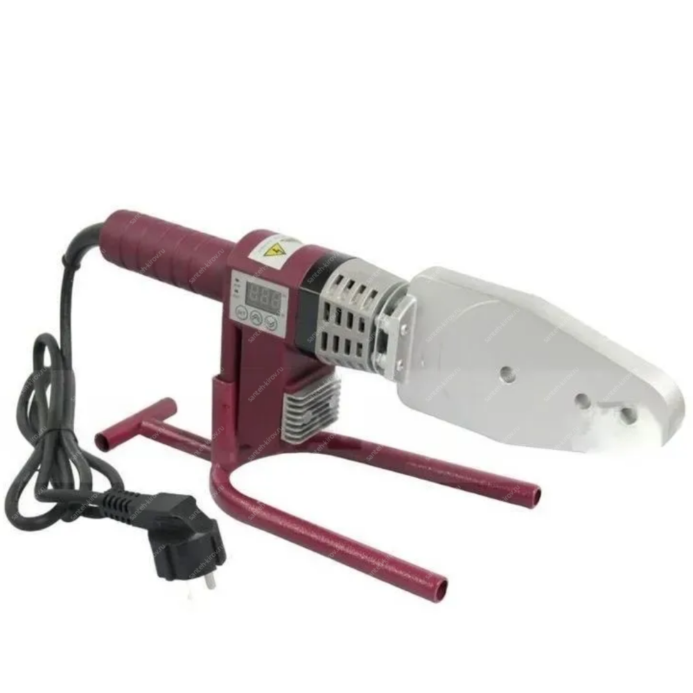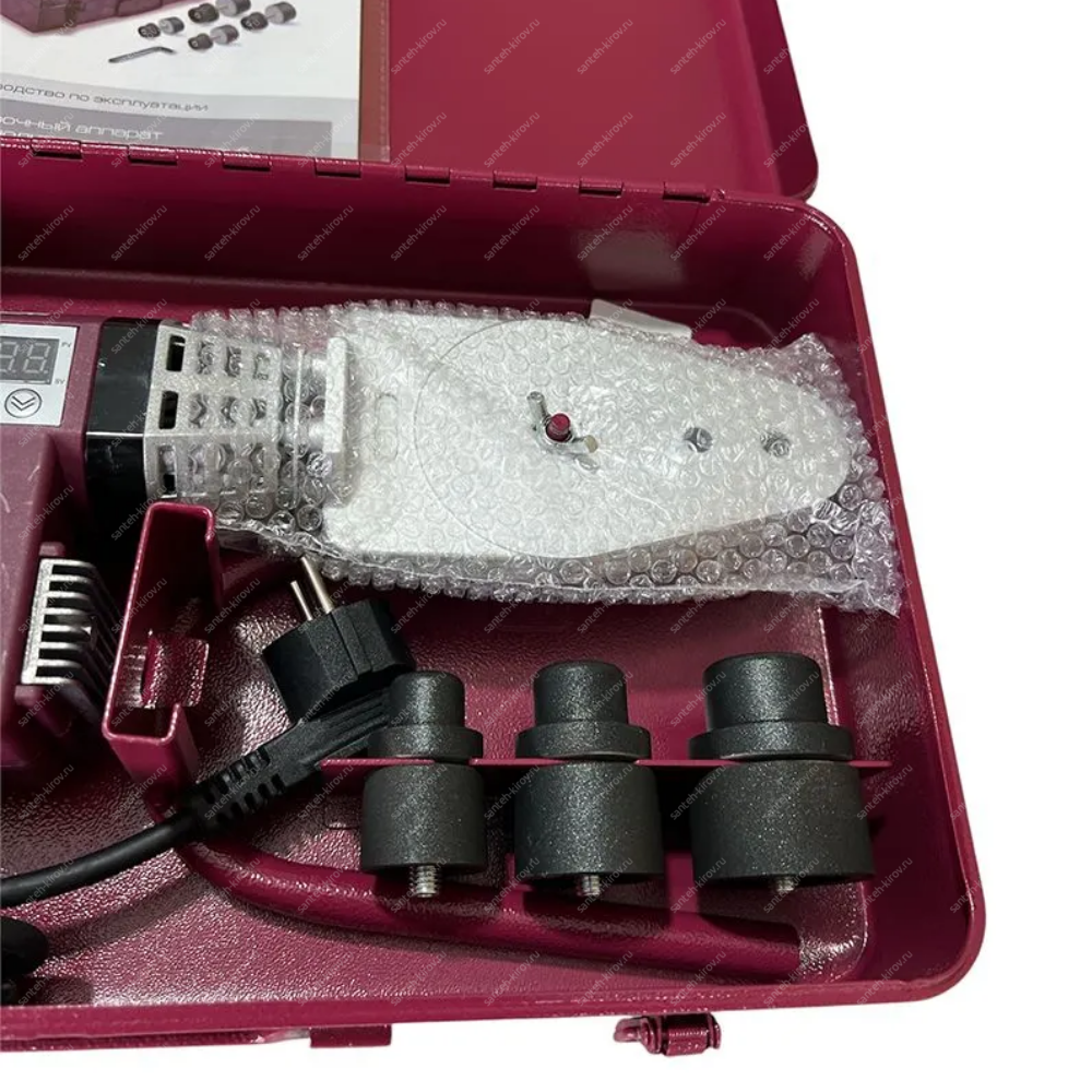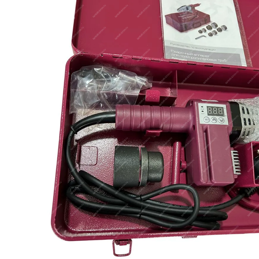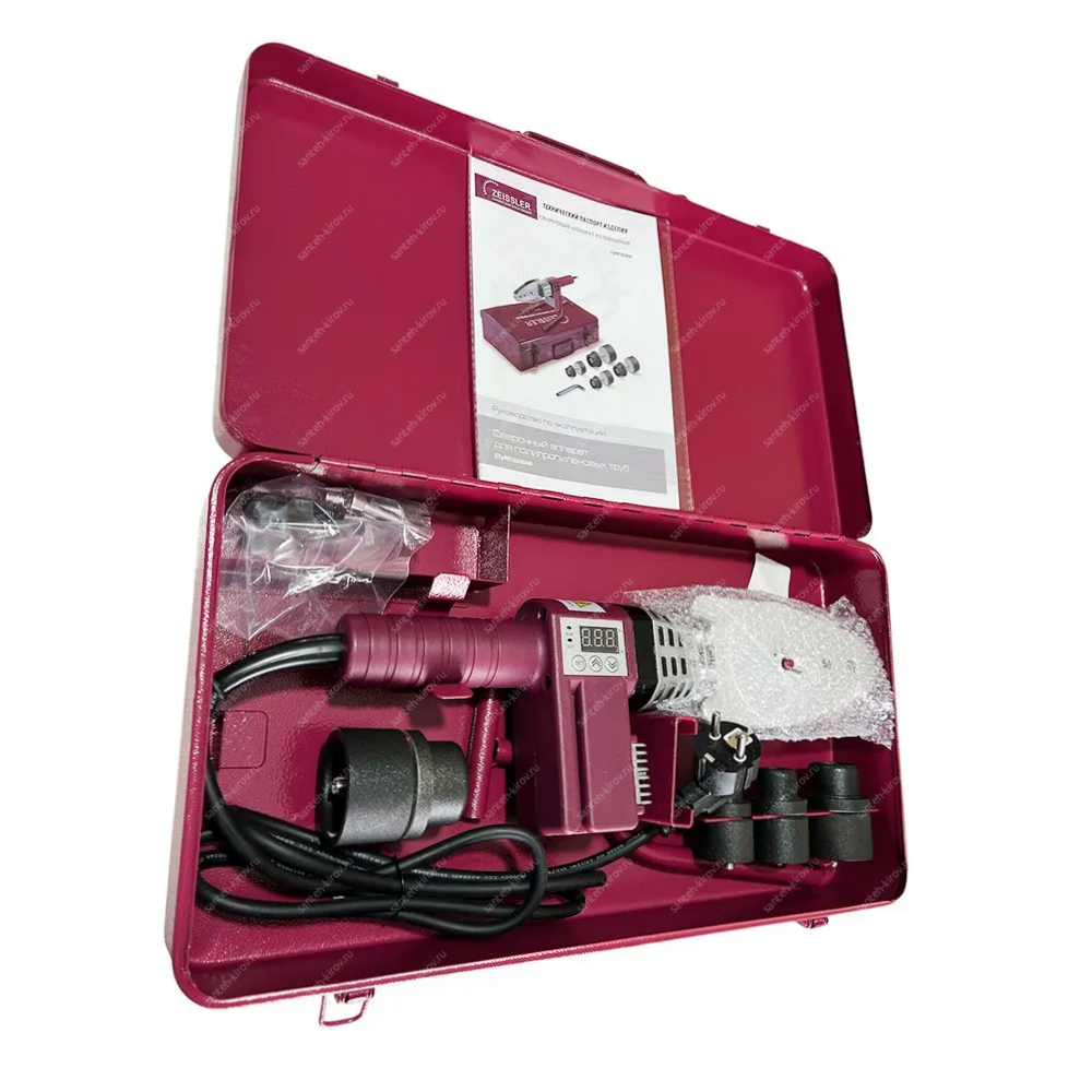 cварочный аппарат 1 шт., насадки (диаметр 20,25,32,40мм), подставка под сварочный аппарат 1шт., руководство по эксплуатации, ключ имбусовый 1шт., винты для крепления 2шт., кейс 1 шт.металлический