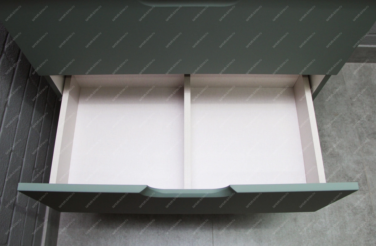 Ящики снабжены скрытыми направляющими полного выдвижения с доводчиком, что обеспечивает их плавную работу и предотвращает внезапные удары или шум при закрытии.