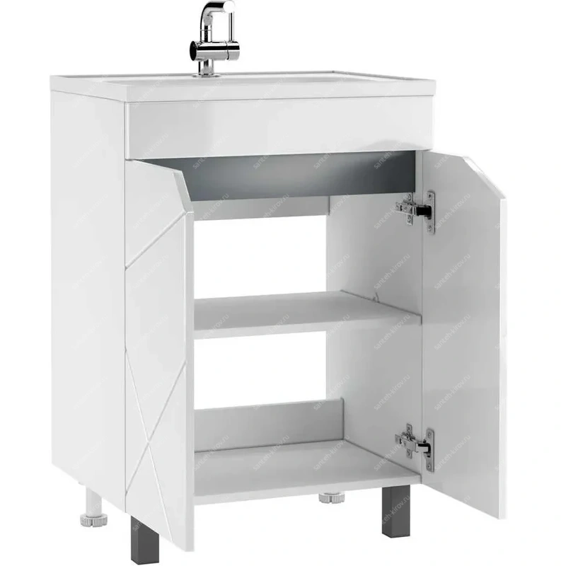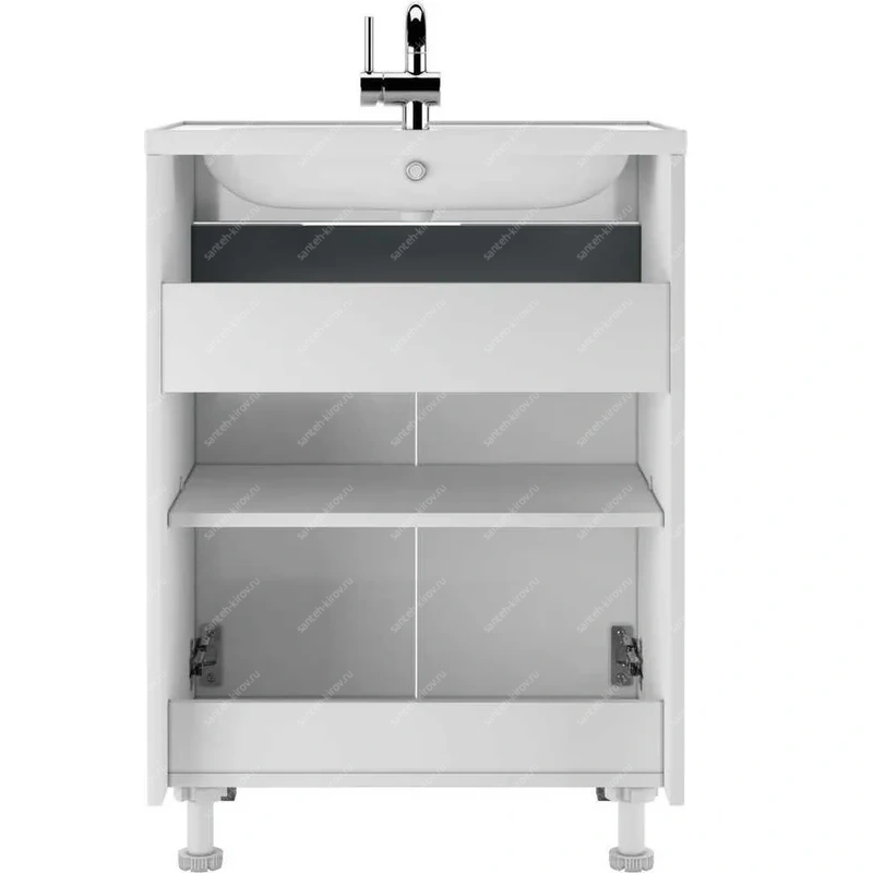Мебель для ванной удобна в использовании. Она предназначена для установки с накладной раковиной. Распашные дверцы обеспечивают доступ к пространству внутри. Регулируемые ножки позволяют адаптировать тумбу под любые неровности пола. Внутри имеется полка, что добавляет функциональности и помогает организовать пространство.