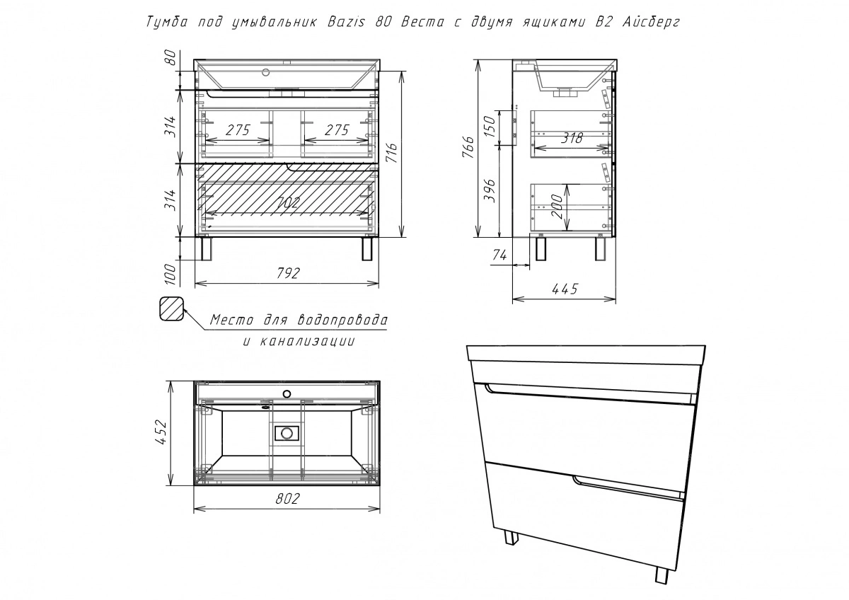 Тумба под раковину выполнена из качественных материалов, что гарантирует долговечность и устойчивость к влаге. Она легко очищается и подходит для активного использования.