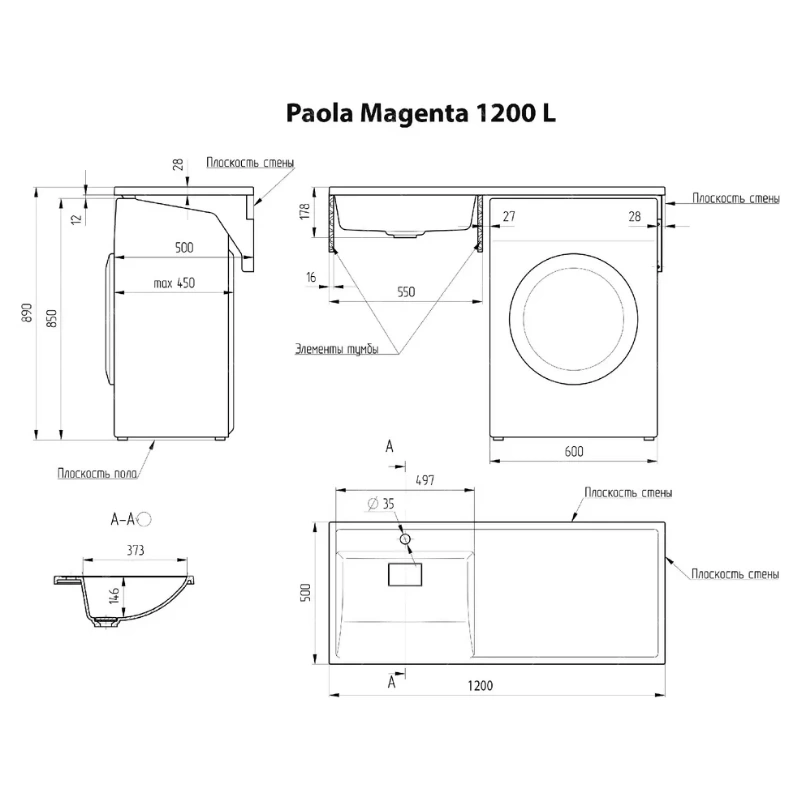 Раковина Paola Magenta 120 левая 1200 L из литьевого мрамора с отверстием под смеситель.