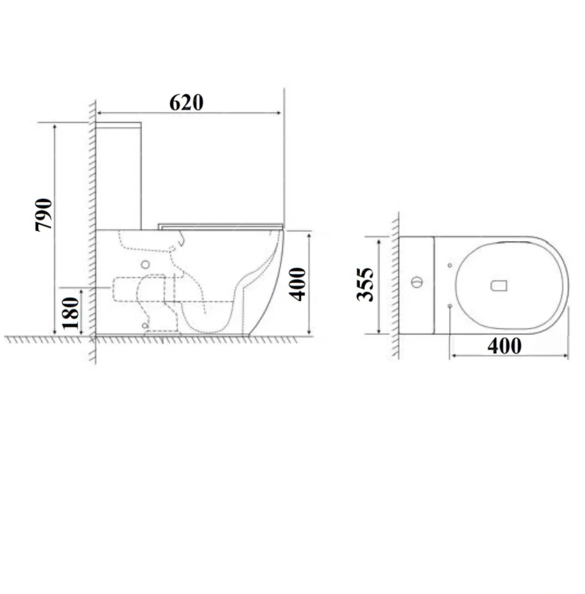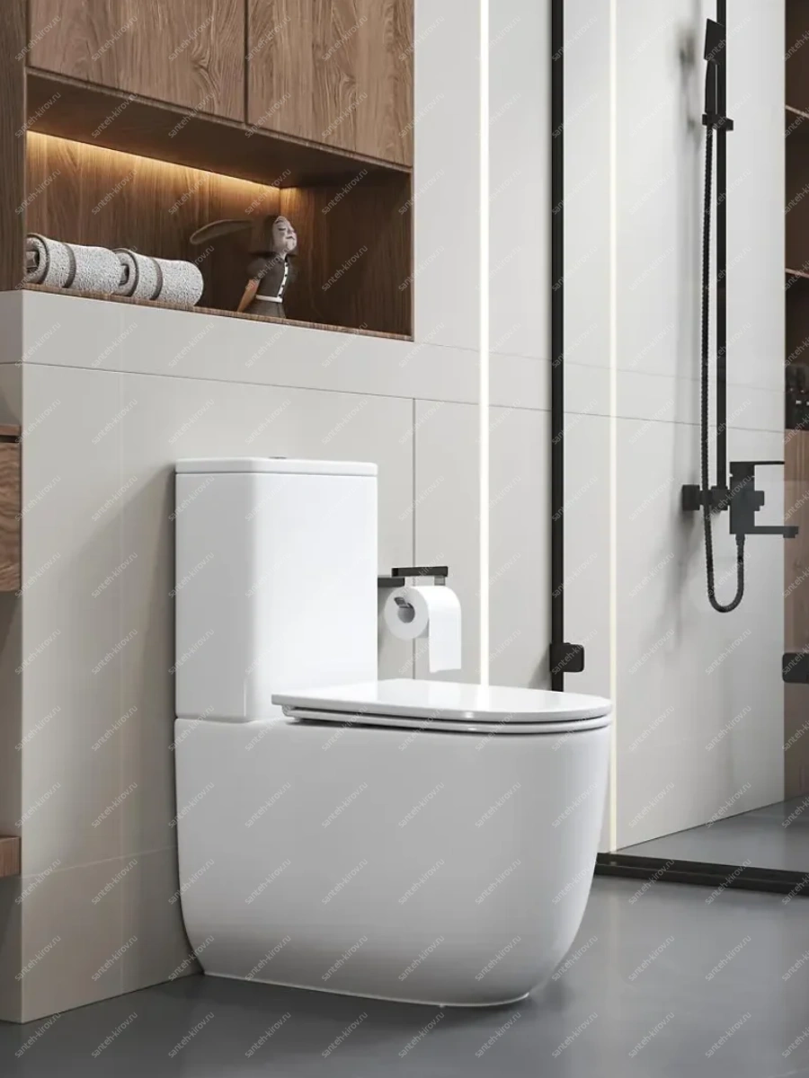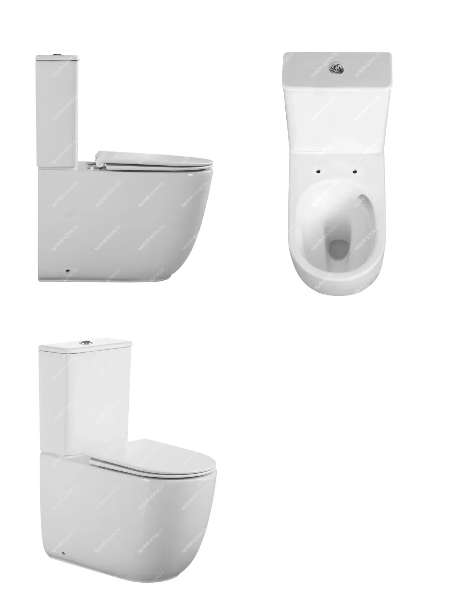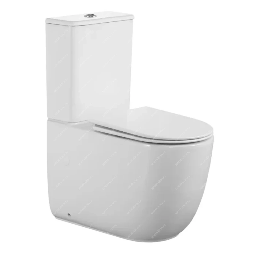 Напольный безободковый унитаз из фаянса со сливным бачком и чашей.