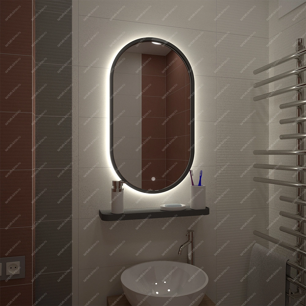 Зеркало с внутренней LED подсветкой, овальное, сенсорное, с пескоструйной обработкой, изготовлено из влагостойкого зеркального полотна толщиной 4 мм производства AGC GLASS EUROPE.