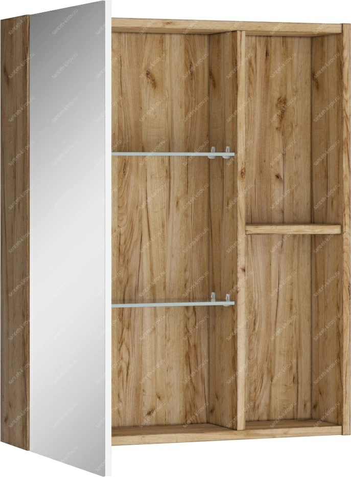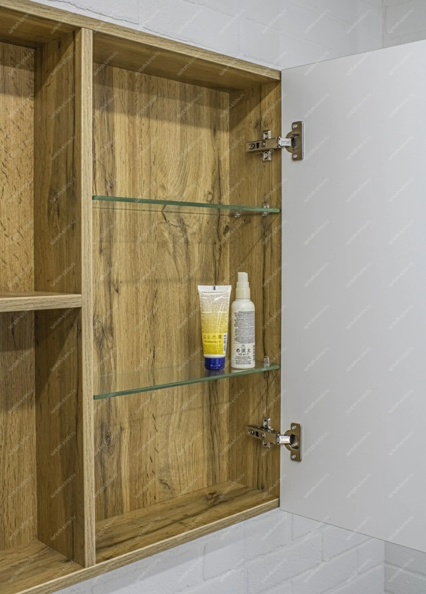 Внутри шкафа предусмотрены стеклянные съемные полки, на которых удобно размещать все необходимые принадлежности. Открытые полки из ЛДСП позволяют хранить предметы первой необходимости под рукой. Шкафчик настенный прекрасно подходит как для просторных санузлов, так и для компактных помещений.